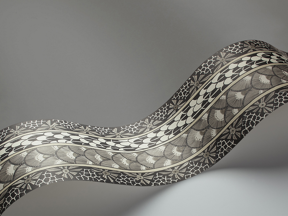 Taken from the decorative detailing on a ceramic vase, this pretty decorative border acts as a decorative edging to many of the papers contained within this collection. Designed to be hung both vertically and horizontally it is offered in three colourings of black and white, soft olive, and a dramatic burnt orange and charcoal.