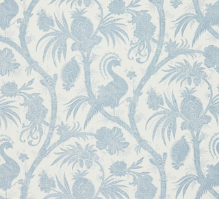Scalamandre – Balinese Peacock: Content: 67% Linen, 33% Cotton, Color: Sky, Type: Table Screen Print Approx Width: 57″ Approx Rpt: V. 21 5/8″, H. 28 1/2″ Dry Clean Only