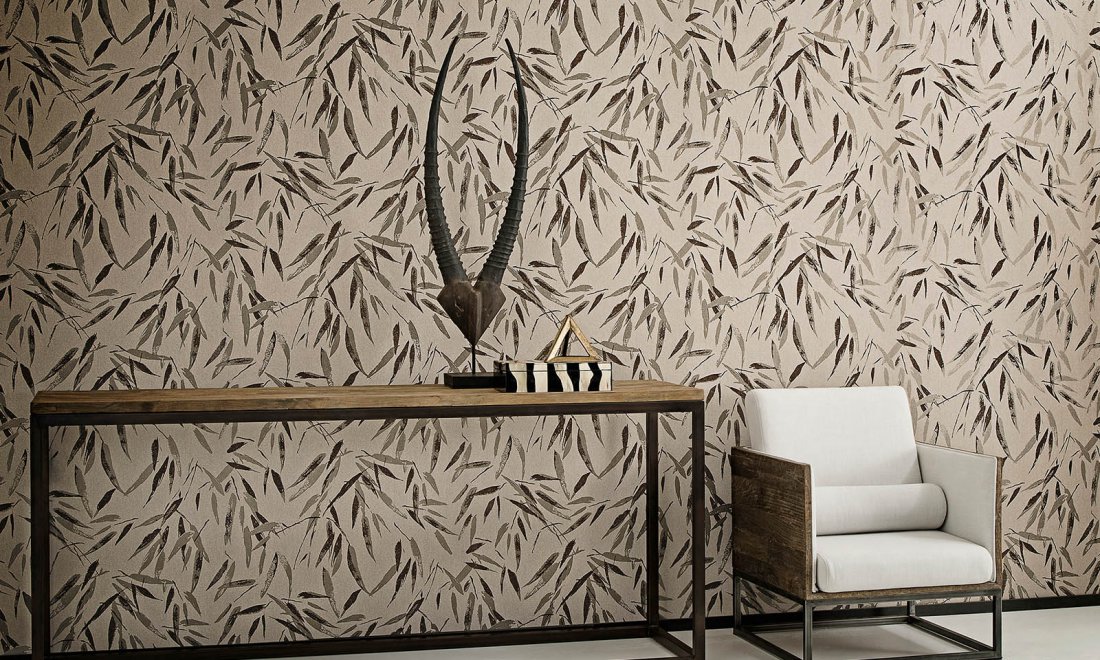Be in no doubt, the linen structure creates a natural look, with the bamboo lending an added nuance. The elegant bamboo leaves in the pattern have an instantaneous cheering effect. The flock and metallic interplay results in a luxurious feel.