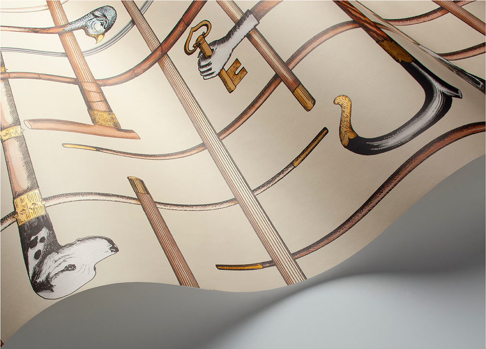 Originating as a silk scarf print from the 1940s, the ‘canes’ of Bastoni reflect the eclectic nature of the house of Fornasetti, brimming with umbrella and hat stands full of antique walking canes. The graphic checkerboard style of the repeat is reminiscent of many Fornasetti favourites, resulting in a striking and bold motif. Bastoni is printed with a gravure four-colour process, to ensure all details remain sharp, with flecks of tonal metallic detail added in a luxurious gold. Choose from three classic colourways of Cream, Racing Car Green, and Charcoal.