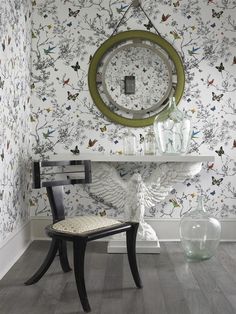 This celebrated pattern is derived from a hand-printed wallcovering that originated in the Decorators Walk collection during the early 1960s. Its colorful creatures take wing amid a black and white gesture drawing of twining foliage adding a summery touch to an interior.