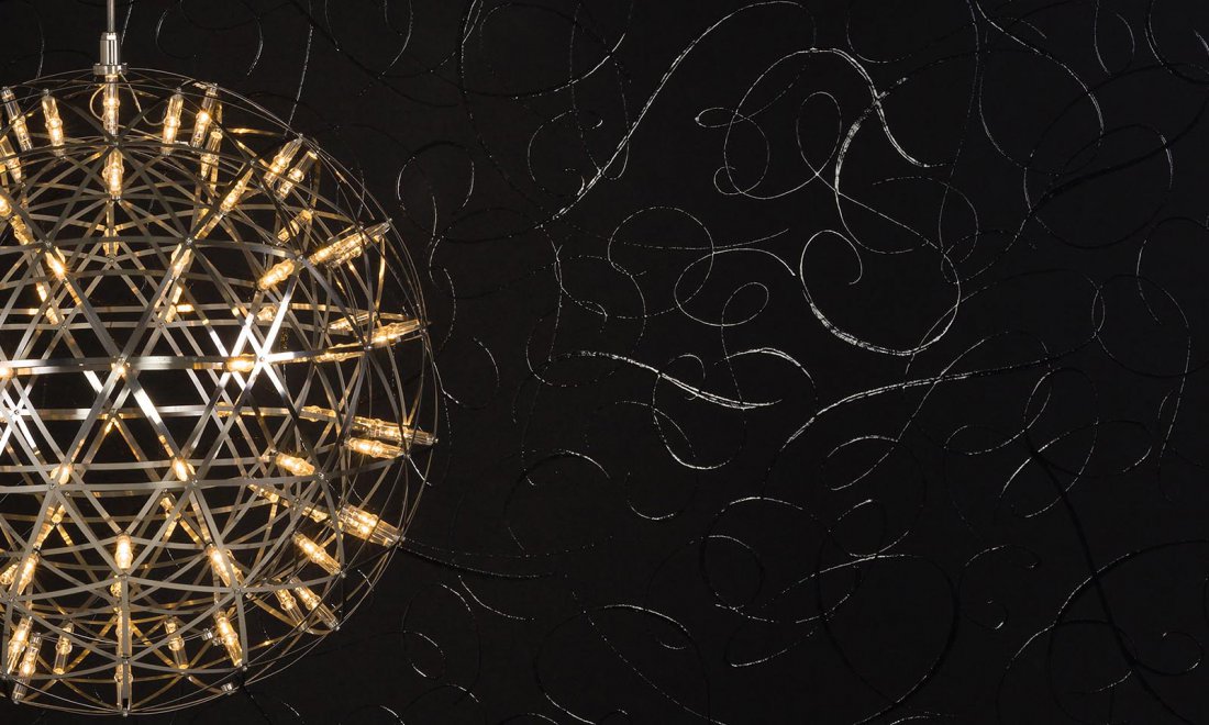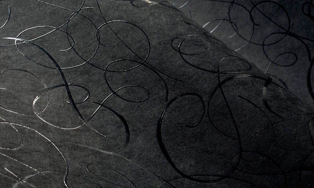 Wallcovering with a high gloss lacquer print, representing the elegant tail feathers of the female Calligraphy Bird that ended in what resembled graceful calligraphy swirls.