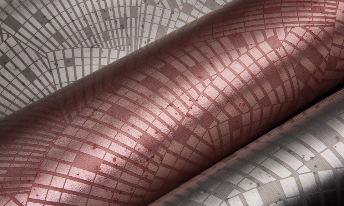 This wallcovering is made of real metal foil. During production, the metal foil goes through an intensive process that was developed especially for this collection. It is coloured in such a way that the wallcovering takes on the nuances of an authentic metal look. Finally, the patterns are embossed on the wallcovering and finished with a thin layer of satin paint. Matching plains can be found in collection Metal X.