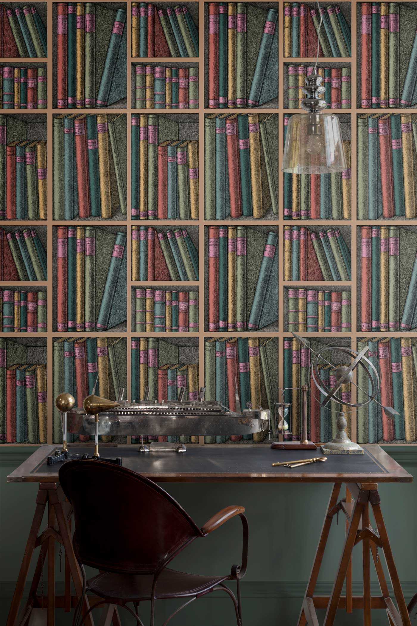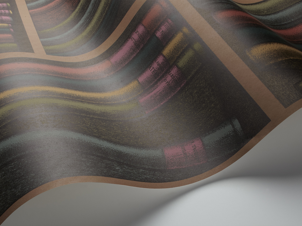 An avid collector of literature volumes on the applied arts, Fornasetti used books as a recurring theme which can be found throughout the Atelier’s archive. This library Trompe l’oeil scene, abundant in leather-bound books, is adapted from a 1953 screen. Reintroduced for Senza Tempo, classic Fornasetti palettes of Stone and Linen, Oat and Charcoal, and Gold and Magenta form a vibrant and conversational wallcovering.
