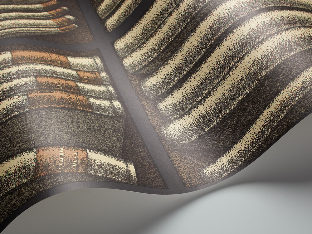 An avid collector of literature volumes on the applied arts, Fornasetti used books as a recurring theme which can be found throughout the Atelier’s archive. This library Trompe l’oeil scene, abundant in leather-bound books, is adapted from a 1953 screen. Reintroduced for Senza Tempo, classic Fornasetti palettes of Stone and Linen, Oat and Charcoal, and Gold and Magenta form a vibrant and conversational wallcovering.