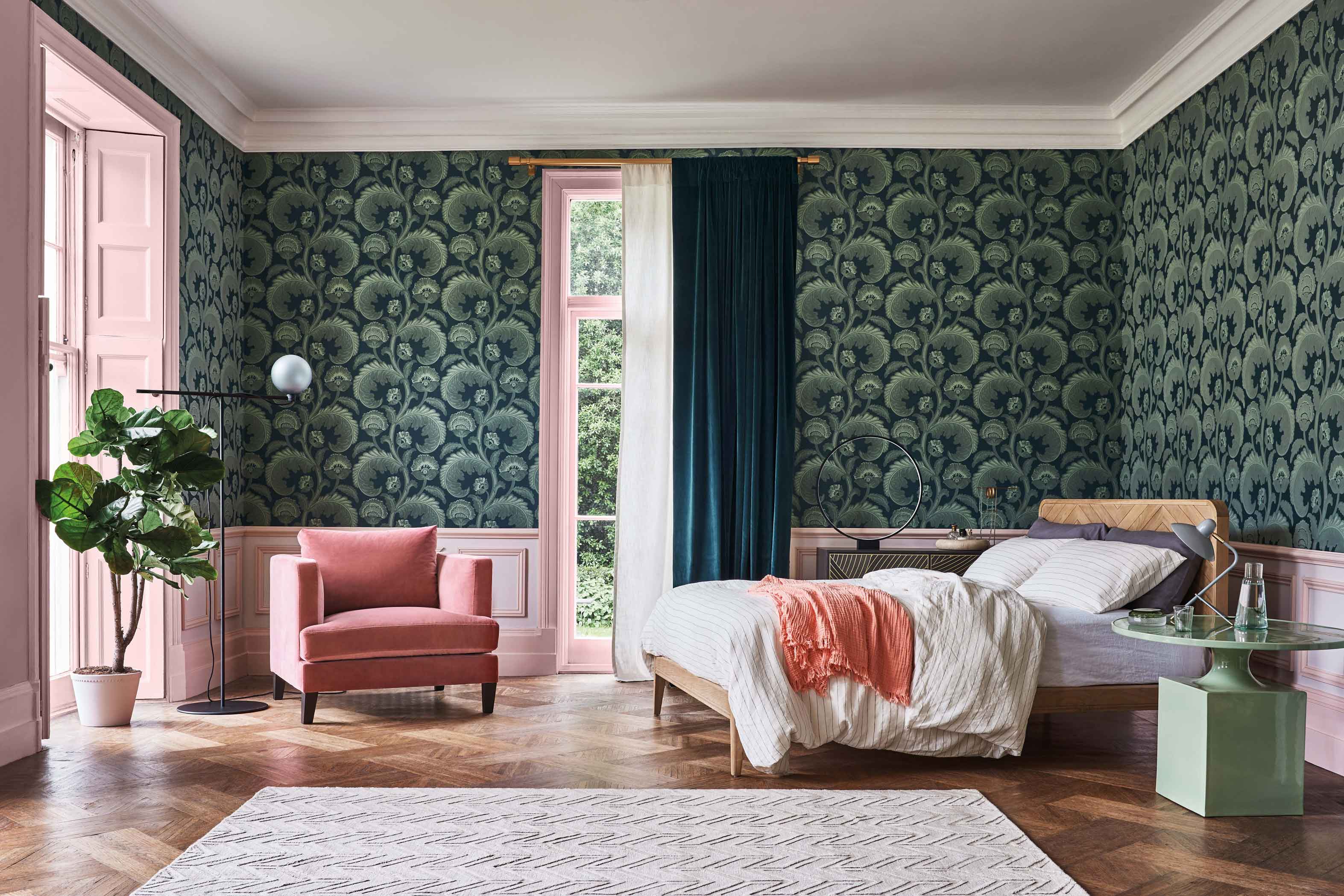 Fanfare Flock is a romantic and decadent contemporary flock paper taken from a 19th-century archive design. Its feather-like leaves are enhanced by the co-ordinating flock overlay, a process reintroduced to the market in the late 1800s by Cole & Son’s founder, John Perry. Its beautifully elegant botanical fanfare is offered in a moody Duck Egg on Dark Petrol; and a rich Ochre on Charcoal.