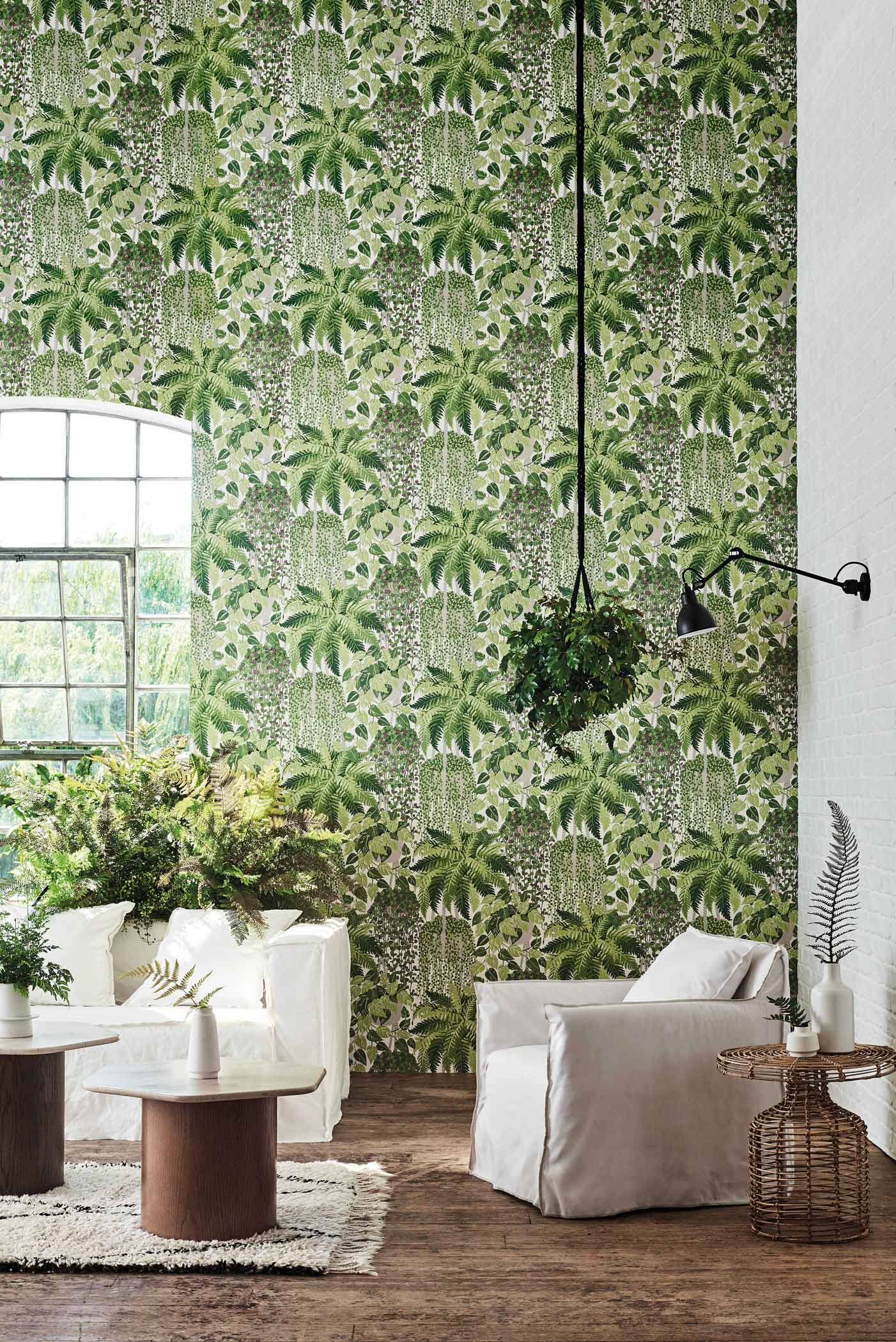 Fern takes us from the garden to the glasshouse where trailing String of Pearls spill from handmade macramé baskets and planters. This distinctly British botanical is a continuation of Cole & Son’s many striking studies of plant life, such as Palm Jungle and Palm Leaves, with its hand-rendered, illustrative style in high summer palettes of Leaf Green & Olive as well as the dusky, winter tones of Viridian & Teal.