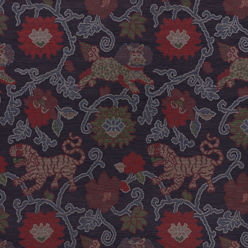 Inspired by antique Tibetan rugs, the luxuriously thick cloth is covered in an enchanting pattern of tigers, snow lions, and lush peonies, and adds a dash of the exotic to a room.