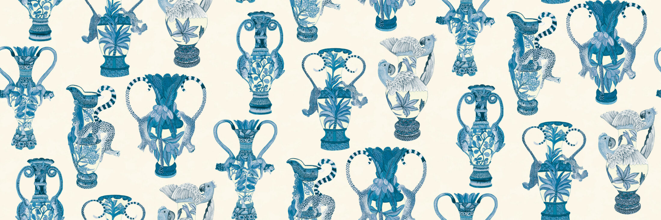 Khulu, meaning ‘most important is a very apt name for this grand design featuring classical vases entwined with leopards, parrots, lions and other African animals. This fabulous wallpaper with its watercoloured paintings pays tribute to those renowned vessels recognised today as ‘modern-day collectables’ by auction houses such as Christie’s, Bonhams and Sotherby’s and displayed in galleries and private collections around the world. Printed to an impressive wide 68.5cm repeat, the design is offered in four colourways including soft pinks and oranges on pale cream, a host of China blues on ivory, vivid greens and charcoal on ivory and finally dramatic petrol and emerald on midnight blue.