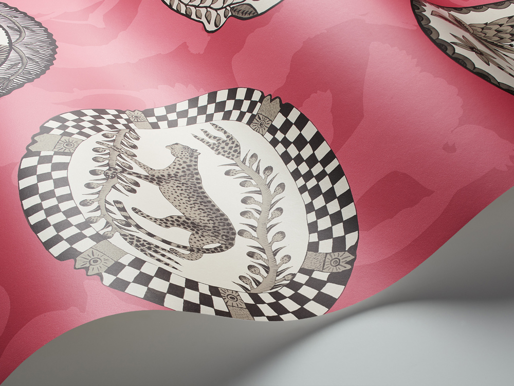 One of the more classical designs within the collection, Matrinah, named after Ardmore designer Matrinah Xaba, reveals an arrangement of ornamental platters and dishes, all intricately patterned with birds and animals and edged with decorative borders and pie crust scallops. These in turn are placed on chalky grounds of olive, taupe, ivory, yellow ochre, and pink featuring the softly silhouetted shapes of the vases from the Khulu Vases design. Presented in five striking colourways which include a subtle gilver on stone and soft gold on olive.