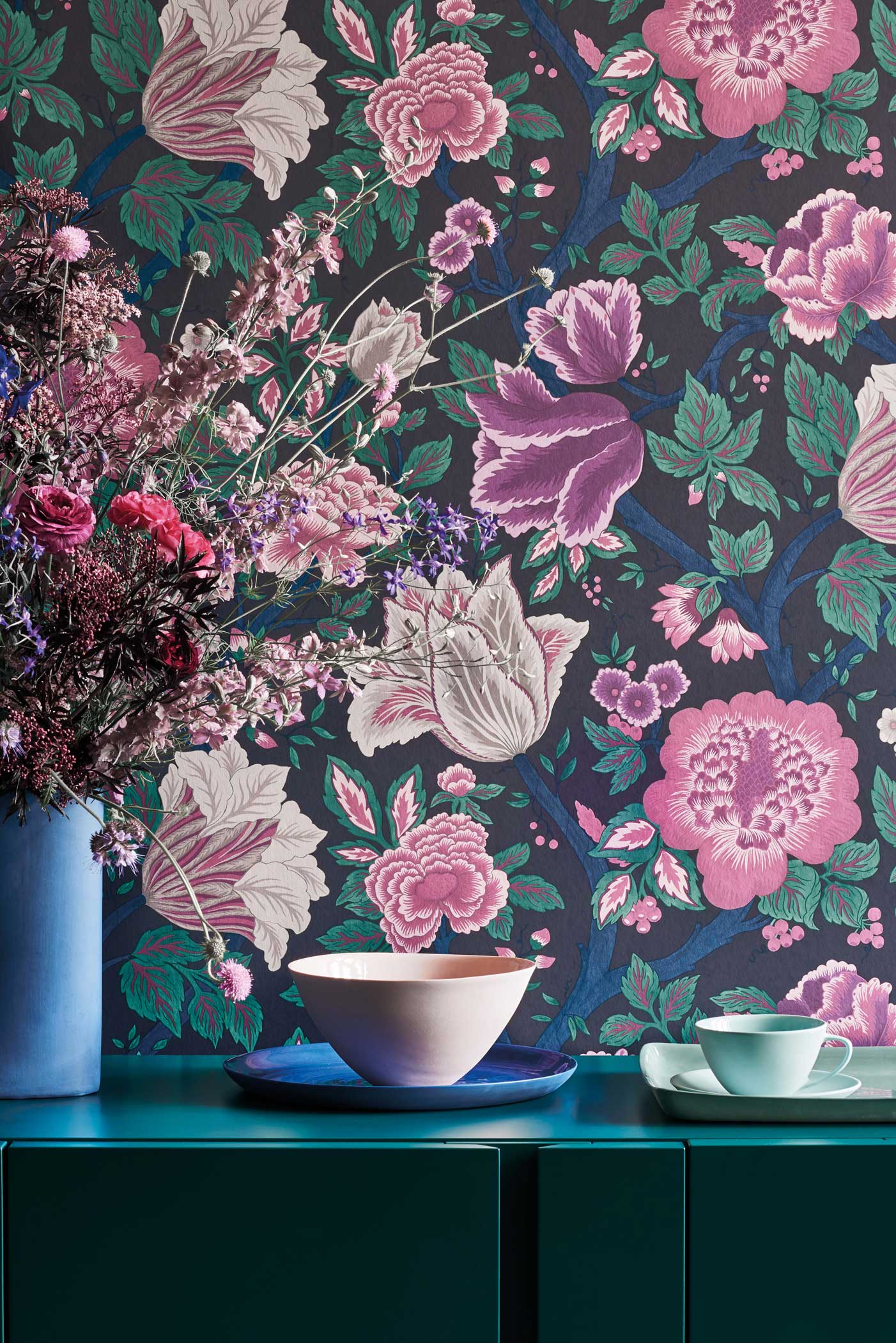 Midsummer Bloom depicts abundant summer flowers in full bloom. This blousy print was found in the Cole & Son archive and re-painted by the Design Studio to create a rich and lavish trailing floral. Moody colorings of Burnt Orange, Rose & Petrol on Ink; and Mulberry, Purple & Teal on Ink give Midsummer Bloom a contemporary update whilst Chartreuse, Rouge & Leaf Green on Parchment; and Hyacinth Blues on Chalk offer a more classically chintzy floral arrangement.