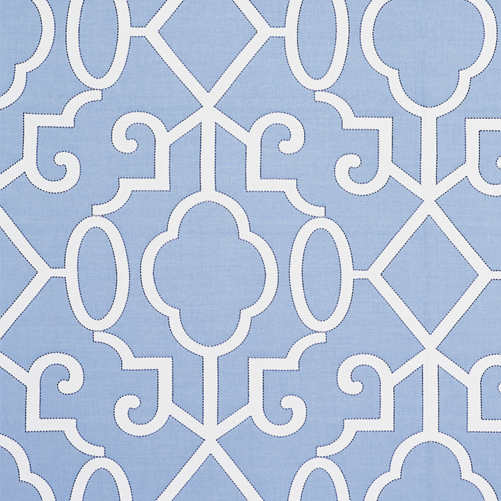 Jacquard, 45% Viscose, 30% Cotton, 25% Linen, Color: Delft, Approx Width: 54″, Approx Rpt: V. 30, H. 27, Dry Clean Only, Can use for Windows and Light Duty Upholstery