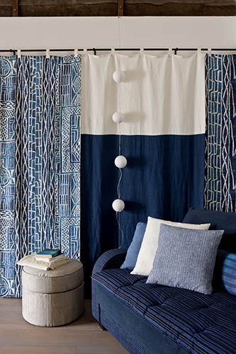 This linen print is a reproduction of a ceremonial hanging from Cameroon dating the early 20th century. These fabrics, known by the name Ndop, are used by the Bamilke and the Bamoun tribes during ceremonials. The design reproduces a stylized plan of great palaces and serves a metaphor of power. Composition: Linen 100%, Color: Indigo, Style: Journeys “Around the World”, Width: 52.36″/133 cm, Type of repeat: Horizontal: 52.36″/133 cm, Vertical: 40.15″/102 cm