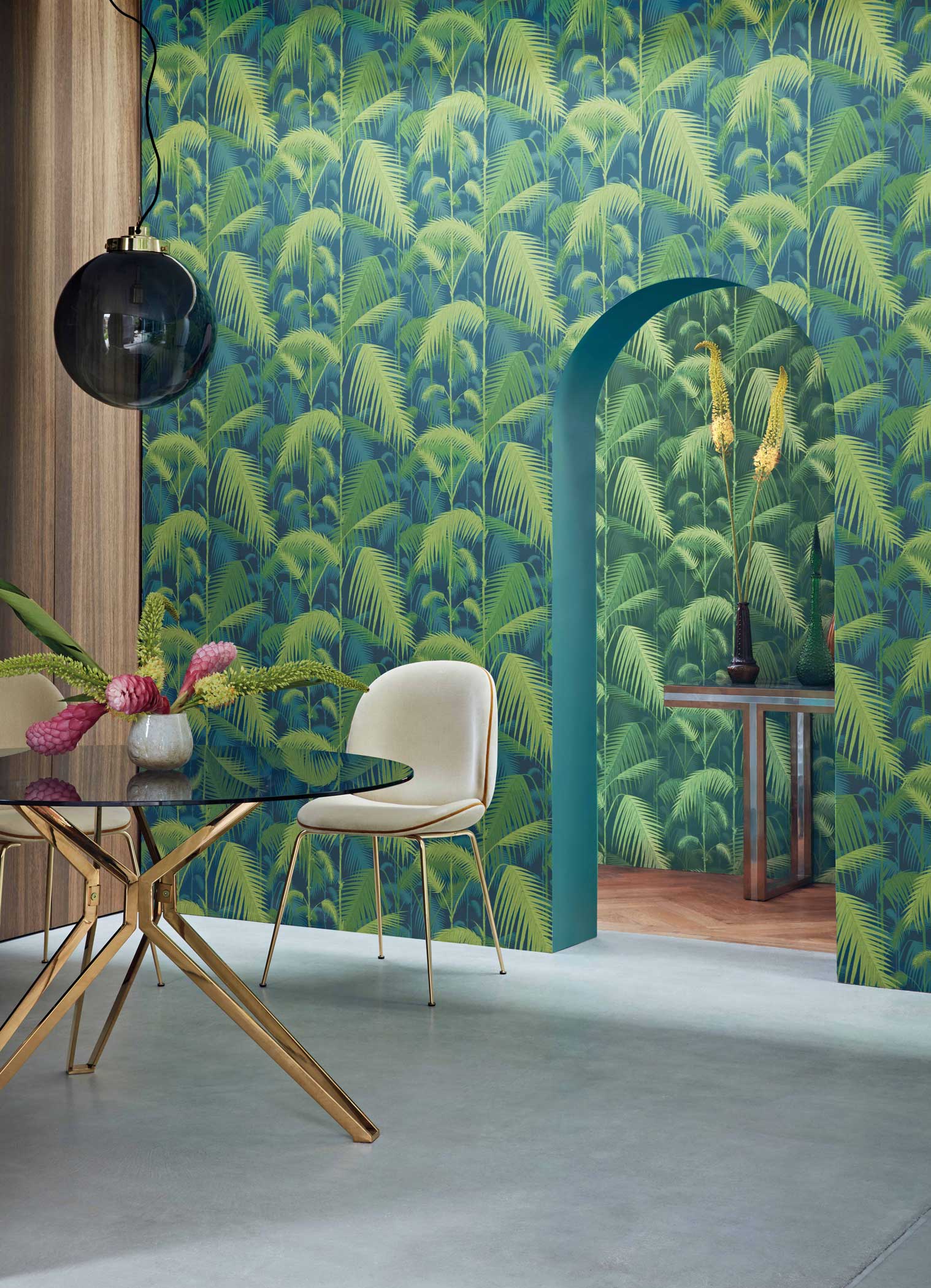 The original Cole and Son Palm print has been reimagined in both bold and understated new colorways whilst retaining all the lush, dense pattern and depth which made the original so popular. Palm Jungle is now available in soft Stone and Taupe, punchy Petrol and Lime, classic Forest Green, and the fittingly 50s-Esque Seafoam.