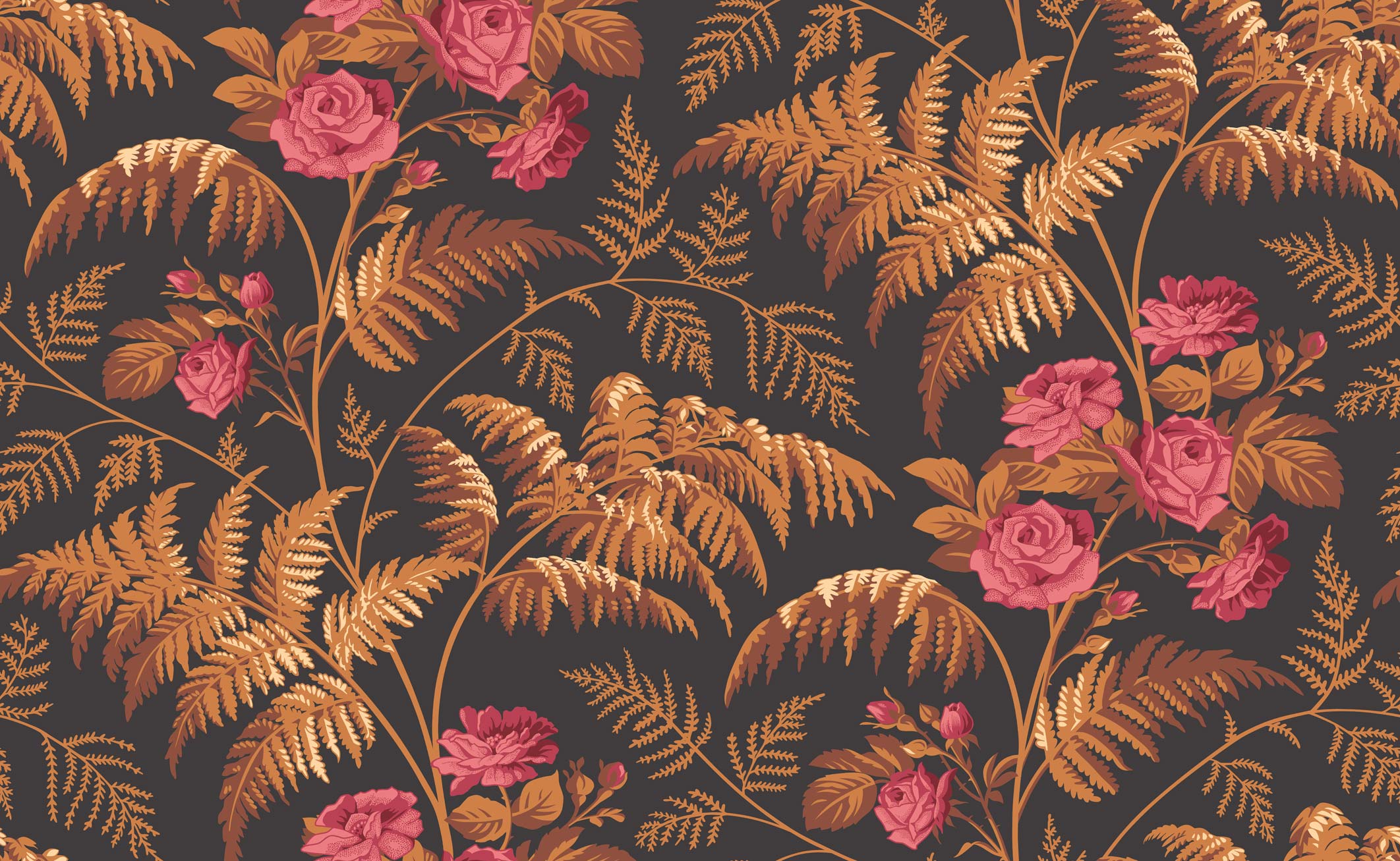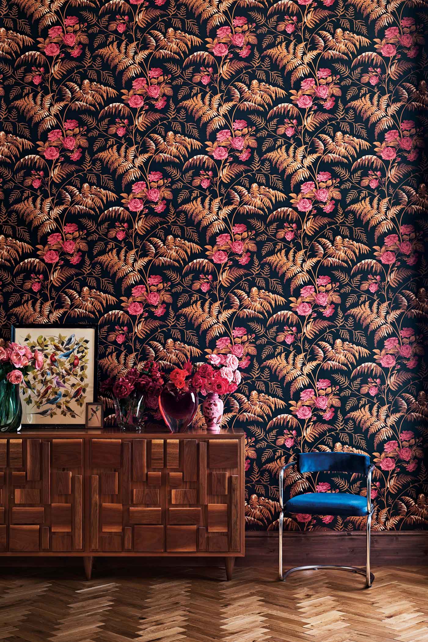 A staple of the English country garden, the blousy Rose is loved as much for its redolent fragrance as its radiant foliage. This charming ogee trail design with lush, budding bouquets is surrounded by fern fronds, creating a richly organic, delicately detailed motif. This quintessentially English pairing has been reimagined in unexpected, contemporary palettes of vivid Cerise & Burnt Orange and deep Black, and cool White & Ice Blue on Denim, as well as a classically toned Red & Leaf Green on smoky Charcoal.
