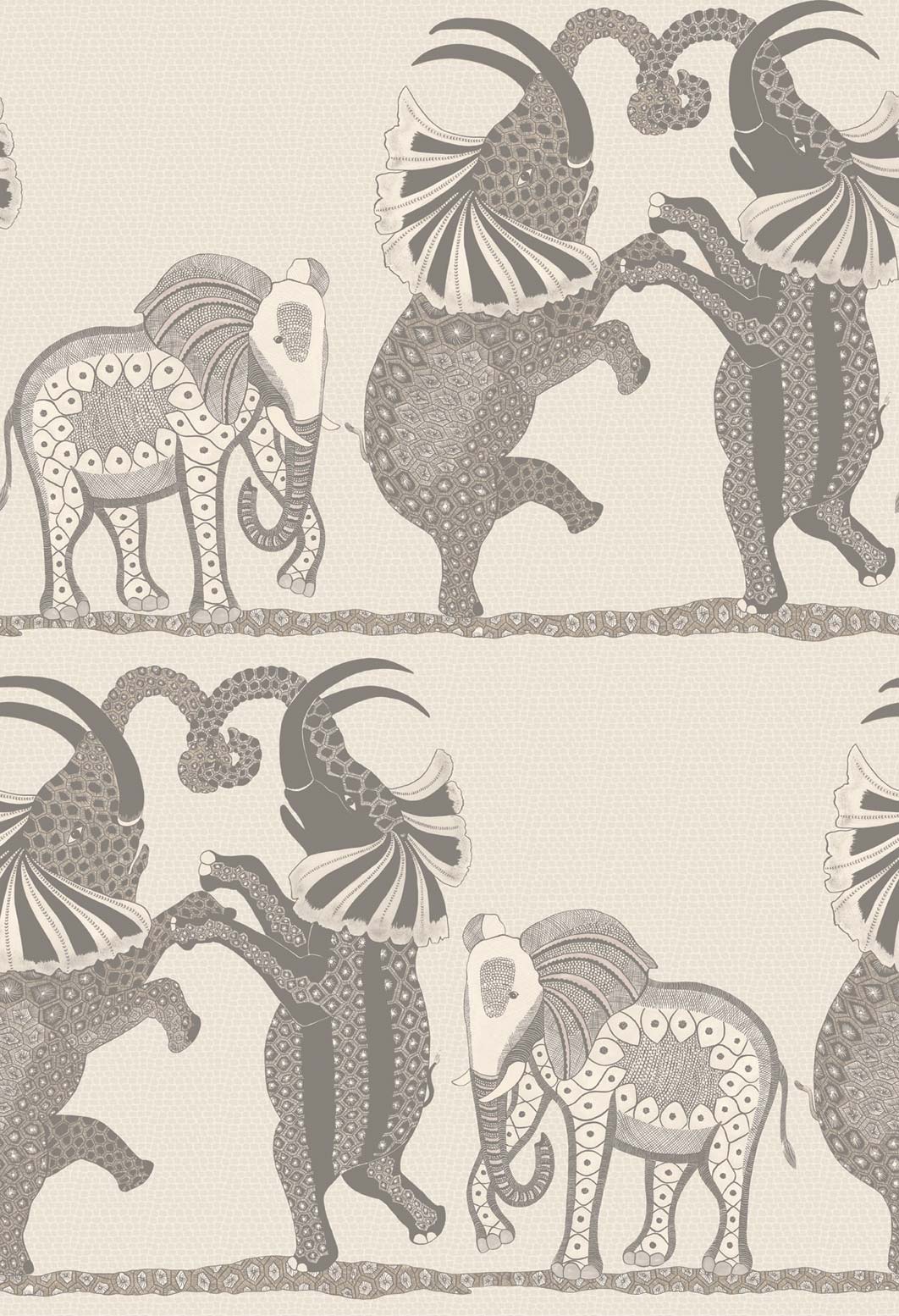 This beautifully patterned wallpaper features a trio of elephants dancing horizontally across the African Plains. Intricately rendered, they are taken from a series of large decorated urns painted by Zinhle Nene which take pride of place in the Ardmore museum. The colouring has been kept quite simple in order to show off the fine hand-drawn elements – charcoal, sand, and stone provide a softly speckled backdrop to black and white, soft mulberry and rust, and cool chalky greys.