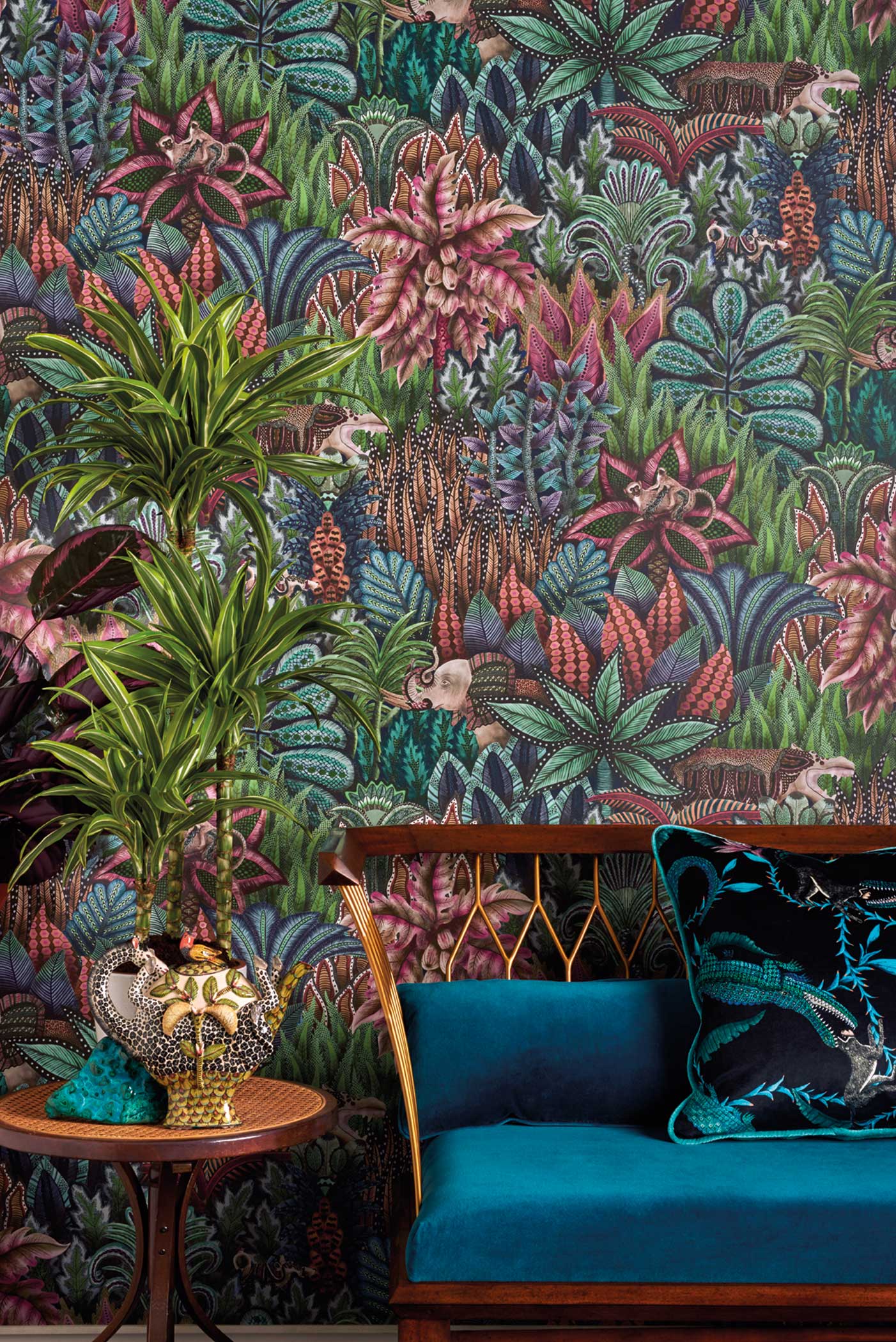 Singita, which means ‘Place of Miracles’ is truly just that! This rich and fabulously patterned forest design has been painstakingly and charmingly hand-painted using the decorative plant motifs and foliage which adorn the painted dishes and bowls created by Ardmore artists over the years. This rich tapestry-like paper with its glimpses of the artist, Alex Sibande’s enigmatic animal travelers strolling through the undergrowth, will create a luxurious backdrop to any interior.