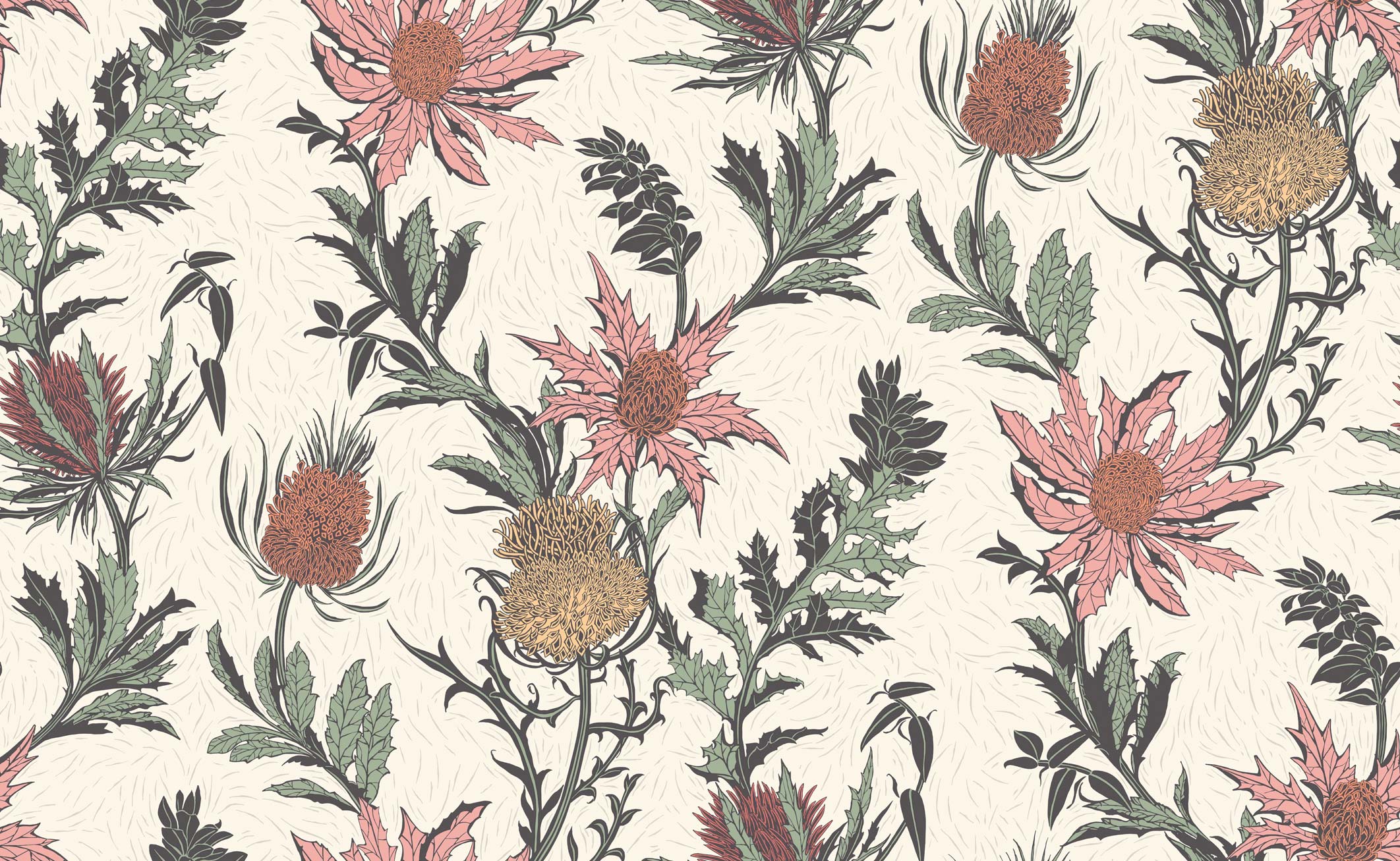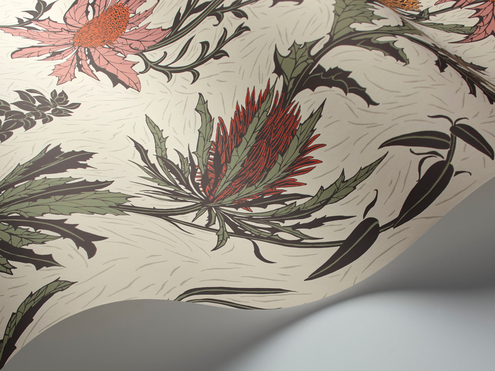 One of the many floral symbols of the British Isles, the unconventional beauty of the Thistle is in its graphic shape of spiny bracts and bursting rosettes. This bold trail design has been printed to reflect a screen print, with a chalky, matte finish to enhance the brittle shape of this stunning wildflower. Seasonal palettes of fresh Lemon & Olive on Duck Egg, muted Alabaster Pink & Orange on Parchment, and a hazy Lilac & Cerise on White enhance this striking motif of iconic blooms.