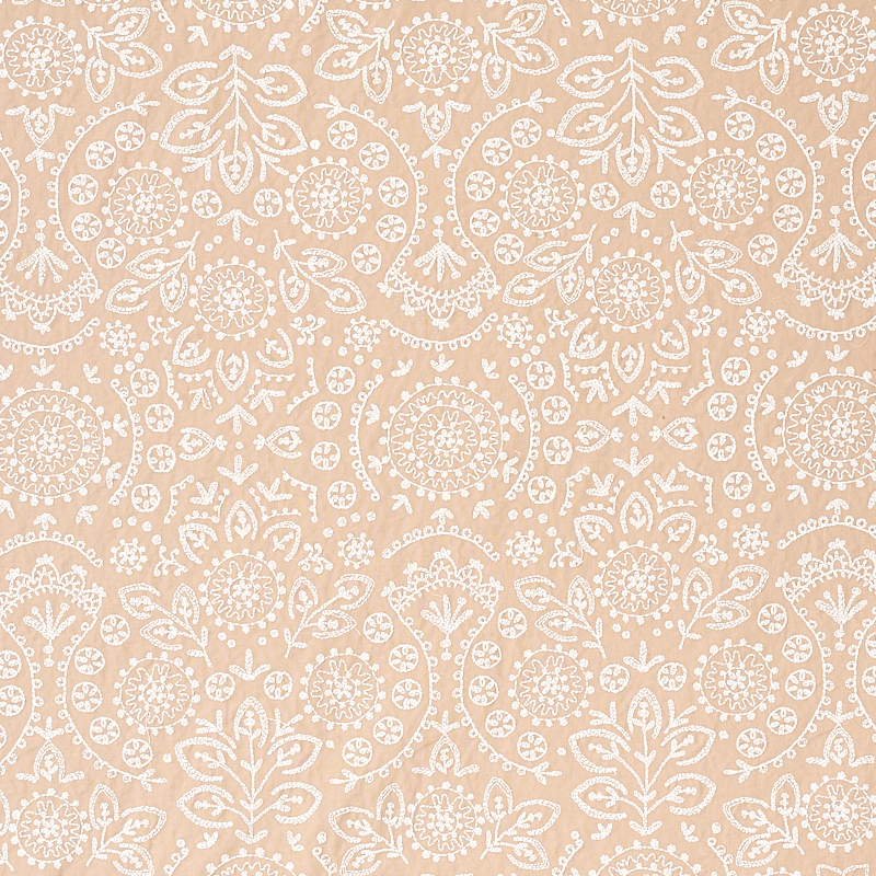 Lacy without feeling too delicate, the mirrored repeat of this unusually large-scale medallion-pattern embroidery has a charming, slightly homespun look.