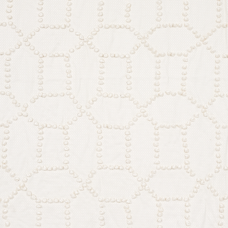 Hand-embroidered chenille French knots form a delicate and perfectly imperfect geometric pattern on a silky cotton-linen ground.