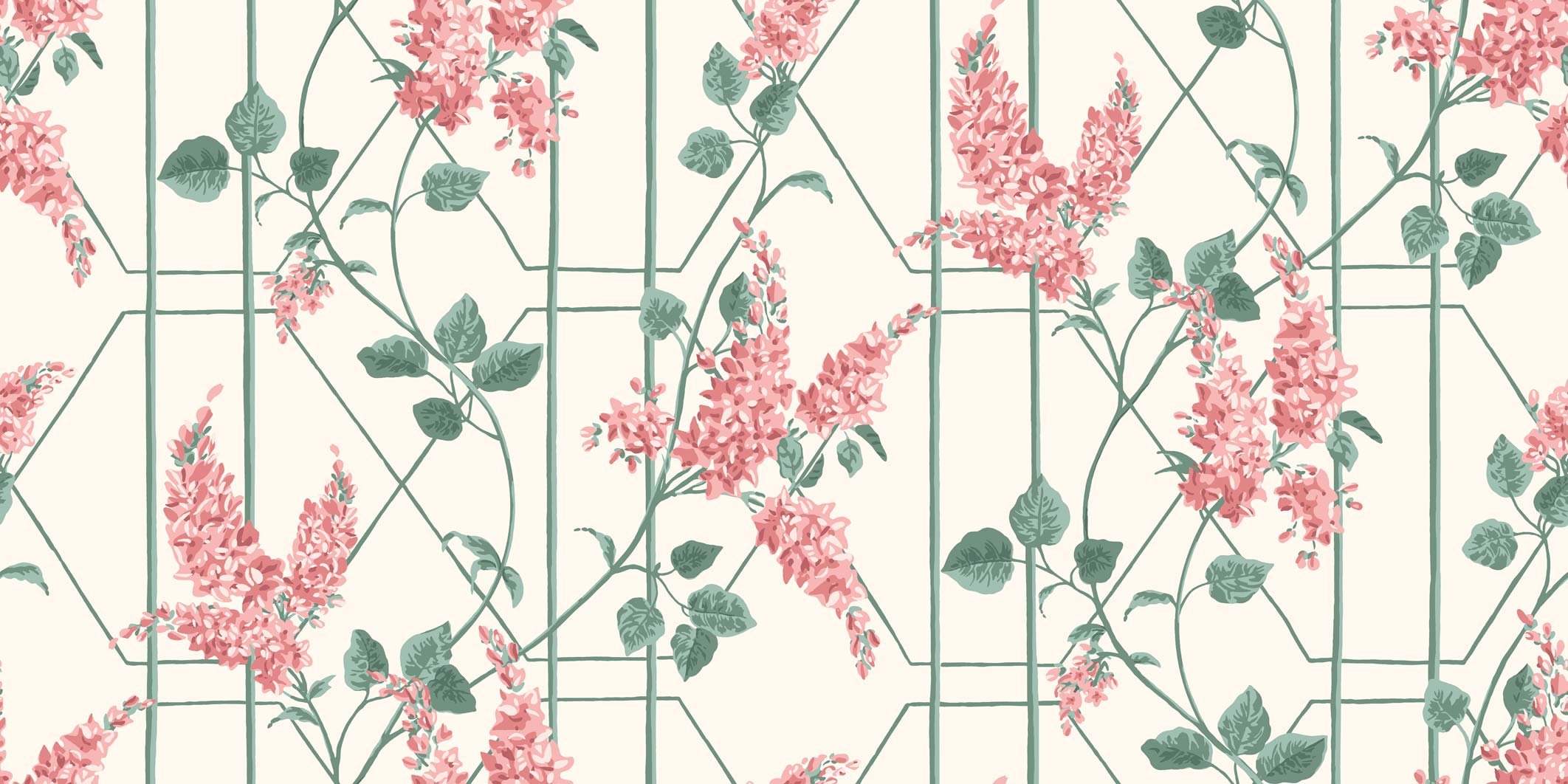 The climbing trail of Wisteria floribunda can be found throughout the Cole & Son archive. This deciduous, sun-loving, summer bloomer with its refulgent racemes has been updated with a trailing hand-drawn trellis to create a graphic print that is as in keeping within a cottage garden as it is in a contemporary setting. Sur-flex printed, Wisteria has a thick, chalky texture bringing each individual bud to the fore in palettes of Coral & Sage on Parchment, Magenta & Leaf Green on White, Stone & Olive on Duck Egg, Powder Blue & Jade on Cerulean Sky, and Sage on Leaf Green.