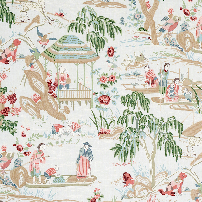 Based on a document from the 1950s and rendered in sublime color combinations, this take on traditional chinoiserie is a true showstopper. Also available as a wallcovering.