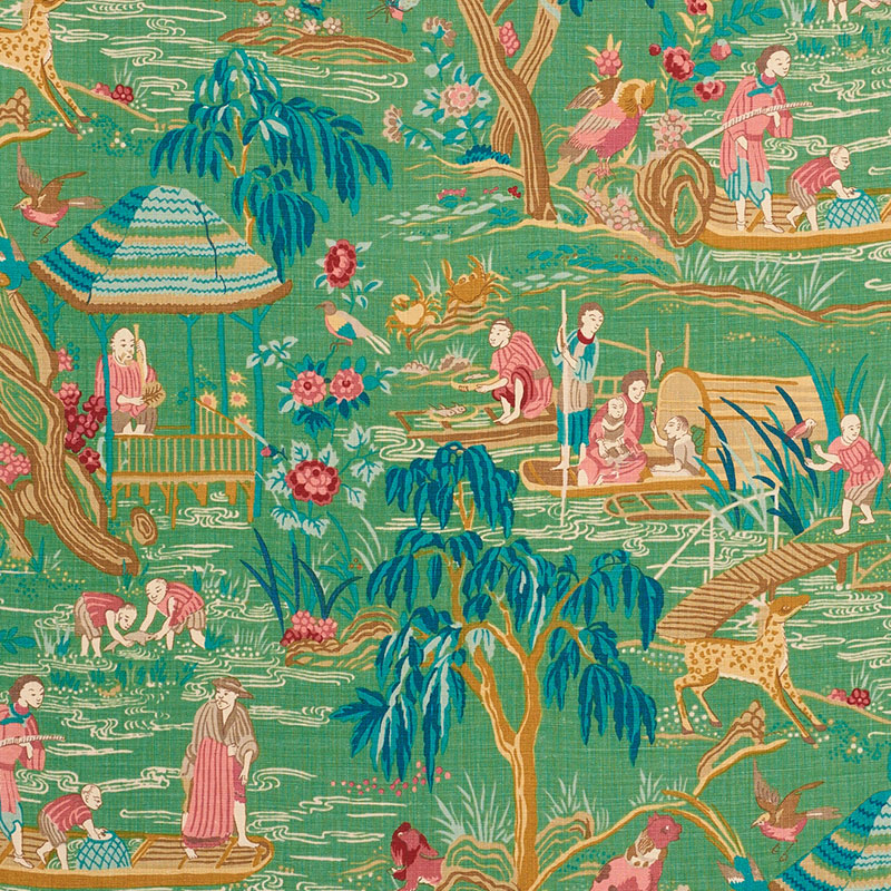 Based on a document from the 1950s and rendered in sublime color combinations, this take on traditional chinoiserie is a true showstopper. Also available as a wallcovering.