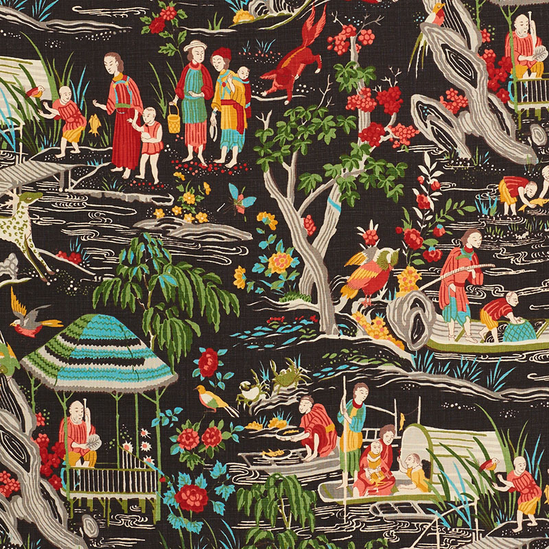 Based on a document from the 1950s and rendered in sublime color combinations, this take on traditional chinoiserie is a true showstopper. Also available as a wallcovering.